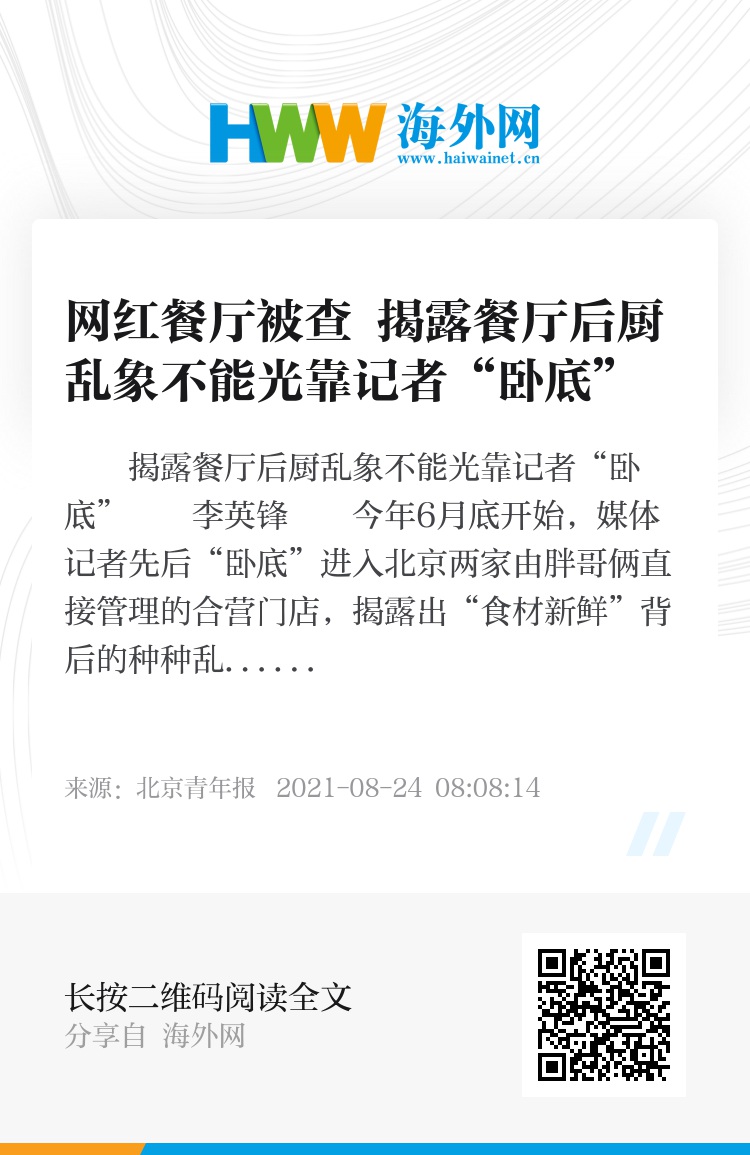这起事件中,餐厅后厨“秘密”的揭露路径值得关注和反思。近年来,已有不少记者通过应聘打工的方法“潜伏”到餐饮后厨,调查揭露了一些餐饮后厨暗藏的环境脏乱差、操作不规范、使用过期变质食材等问题,其中不乏网红餐厅。记者卧底调查颇有成效,可谓“一查一个准”,但媒体毕竟不是主要的监督责任主体,揭露餐饮后厨乱象,不能光靠记者卧底调查,市场监管部门等监管主力军应该承担更多责任,拿出更多有效行动,释放更多监督正能量。