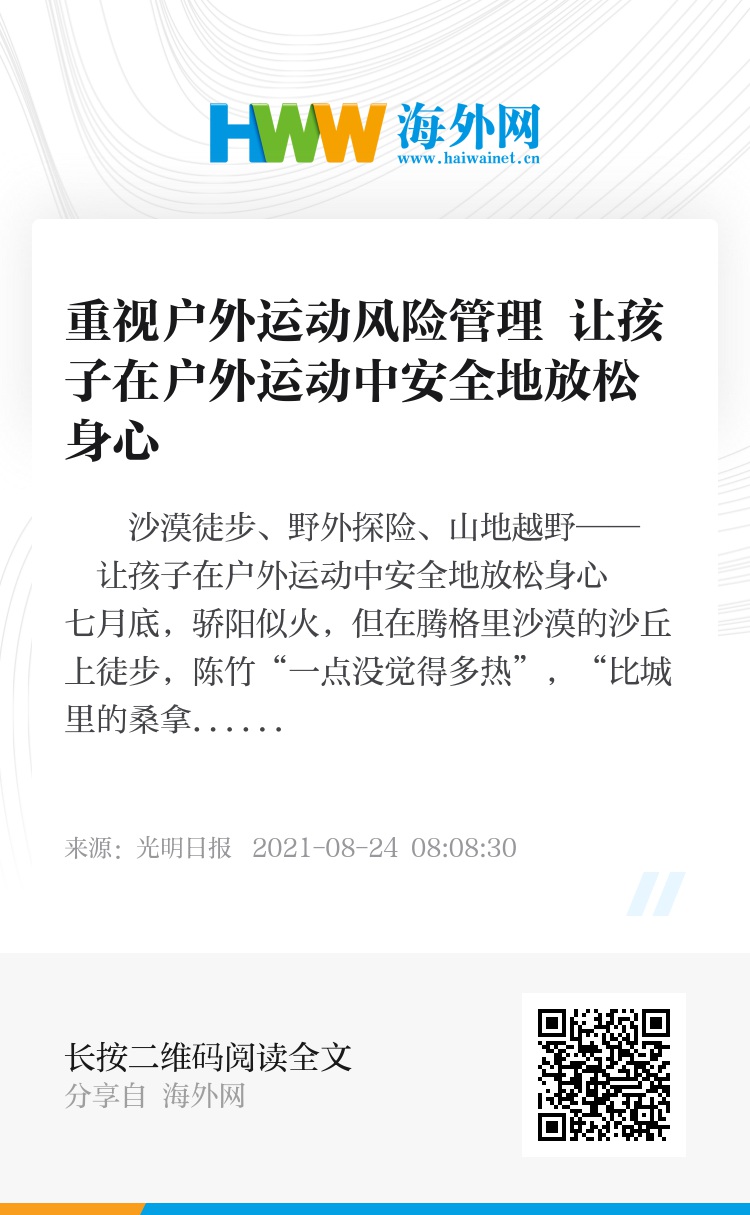徒步、攀岩、登山、冲浪、滑翔……多样的户外运动,正受到越来越多青睐,更逐渐进入青少年的生活。假期里,户外运动开展得如火如荼。陈竹在沙漠徒步时,在营地附近碰到城里的小学生被老师带着,当天走完30公里。