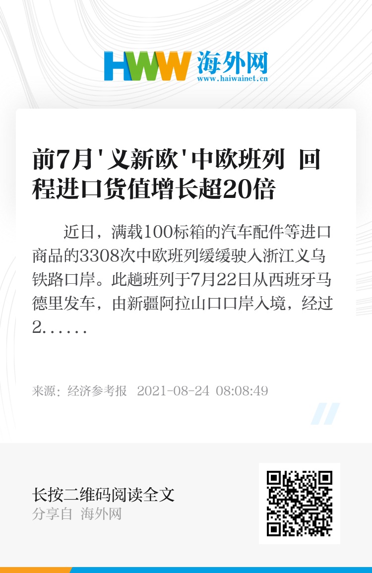 据杭州海关统计,1-7月,中欧(义新欧)班列进出口货值达267.1亿元,同比增长130.7%,其中进口64.9亿元,同比增长21.4倍。