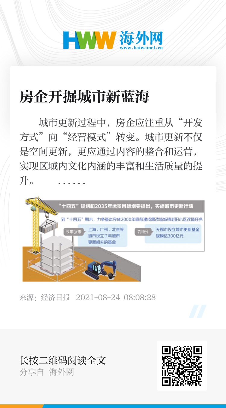 房企参与城市更新有望获得更多支持。“十四五”规划和2035年远景目标纲要明确提出,实施城市更新行动。老旧小区改造是城市更新的重要内容之一,我国提出,到“十四五”期末,结合各地实际,力争基本完成2000年底前建成需改造城镇老旧小区改造任务。住房和城乡建设部有关负责人曾表示,鼓励房地产开发企业参与老旧小区改造。今年以来,多省市密集出台相关举措推进城市更新。除上海设立了城市更新基金以外,据报道,7月份无锡市也设立了城市更新基金,基金规模达300亿元,专项用于投资无锡旧城区改造和城市更新项目规划、建设、开发及运营等。此外,广州、北京等城市也设立了与城市更新相关的基金。