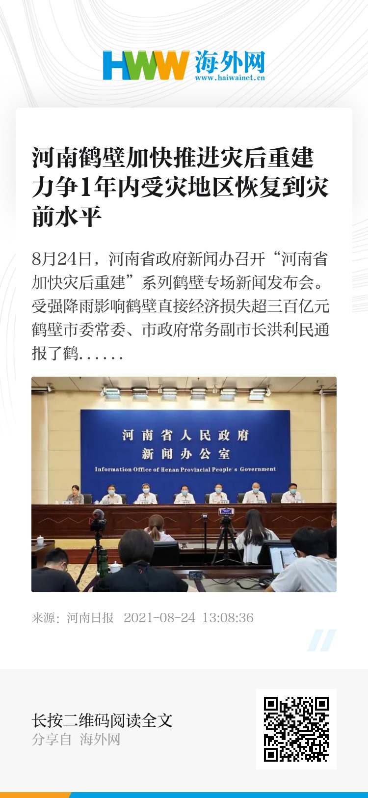 8月24日,河南省政府新闻办召开“河南省加快灾后重建”系列鹤壁专场新闻发布会。