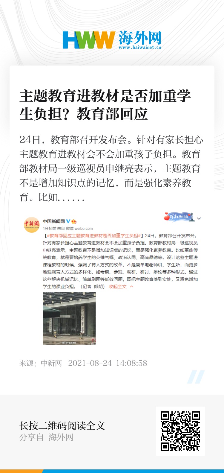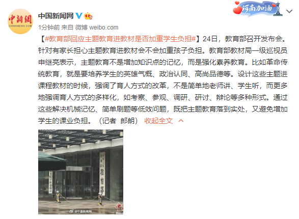 24日,教育部召开发布会。针对有家长担心主题教育进教材会不会加重孩子负担。教育部教材局一级巡视员申继亮表示,主题教育不是增加知识点的记忆,而是强化素养教育。比如革命传统教育,就是要培养学生的英雄气概、政治认同、高尚品德等。设计这些主题进课程教材的时候,强调了育人方式的改革,不是简单地老师讲、学生听,而更多地强调育人方式的多样化,如考察、参观、调研、研讨、辩论等多种形式。通过这些解决机械记忆、简单刷题等低效问题,既把主题教育落到实处,又避免增加学生的课业负担。(记者 郎朗)