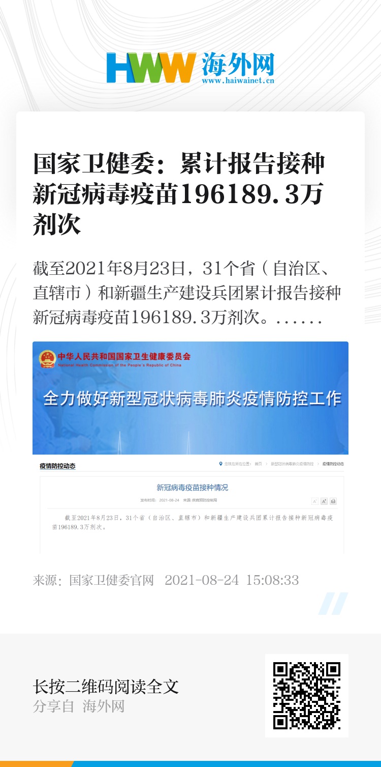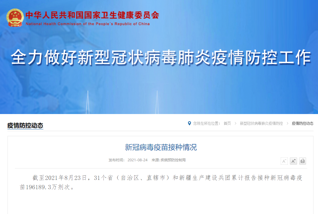 截至2021年8月23日,31个省(自治区、直辖市)和新疆生产建设兵团累计报告接种新冠病毒疫苗196189.3万剂次。