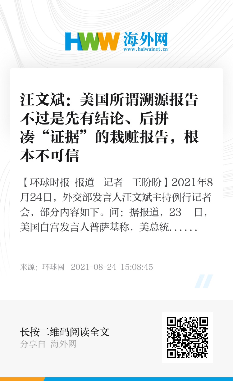 问:据报道,23 日,美国白宫发言人普萨基称,美总统拜登要求情报机构提供的新冠病毒起源分析报告预计将于24日完成,但仍需数天才能完成可对外公布的非机密版本,中方对此有何评论?