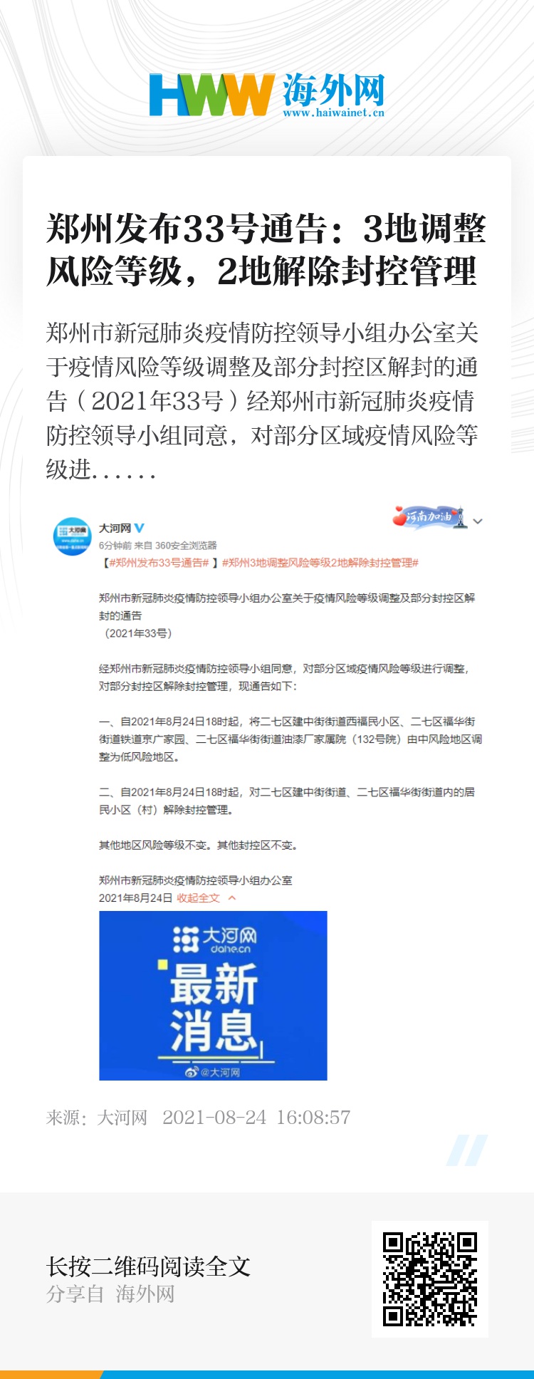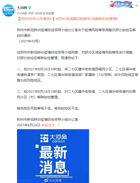 一、自2021年8月24日18时起,将二七区建中街街道西福民小区、二七区福华街街道铁道京广家园、二七区福华街街道油漆厂家属院(132号院)由中风险地区调整为低风险地区。