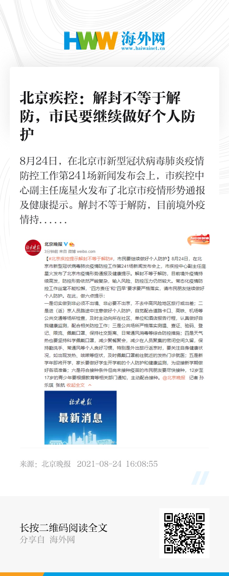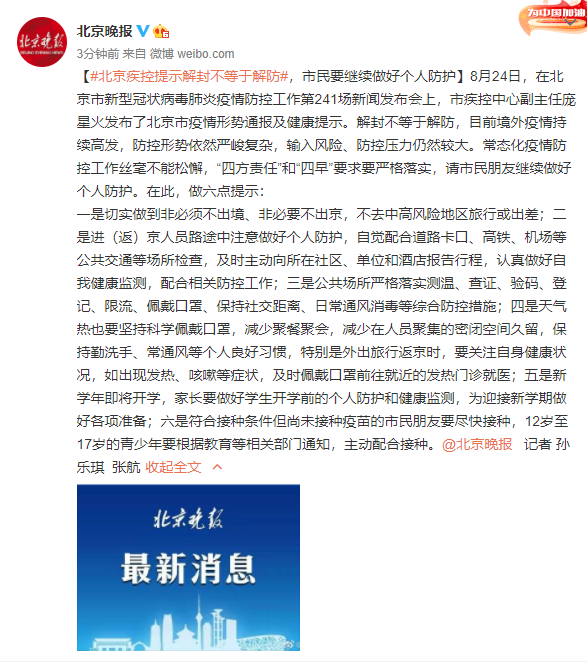 8月24日,在北京市新型冠状病毒肺炎疫情防控工作第241场新闻发布会上,市疾控中心副主任庞星火发布了北京市疫情形势通报及健康提示。解封不等于解防,目前境外疫情持续高发,防控形势依然严峻复杂,输入风险、防控压力仍然较大。常态化疫情防控工作丝毫不能松懈,“四方责任”和“四早”要求要严格落实,请市民朋友继续做好个人防护。在此,做六点提示: