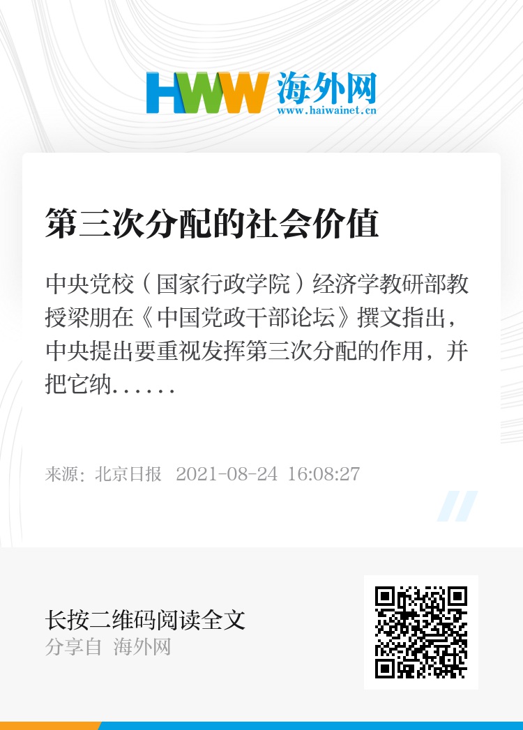 中央党校(国家行政学院)经济学教研部教授梁朋在《中国党政干部论坛》撰文指出,中央提出要重视发挥第三次分配的作用,并把它纳入国家治理体系和治理能力现代化的制度建设中,充分体现了我们党的系统思维和战略思维能力。
