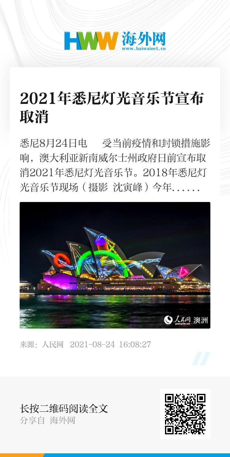 人民网悉尼8月24日电 受当前疫情和封锁措施影响,澳大利亚新南威尔士州政府日前宣布取消2021年悉尼灯光音乐节。