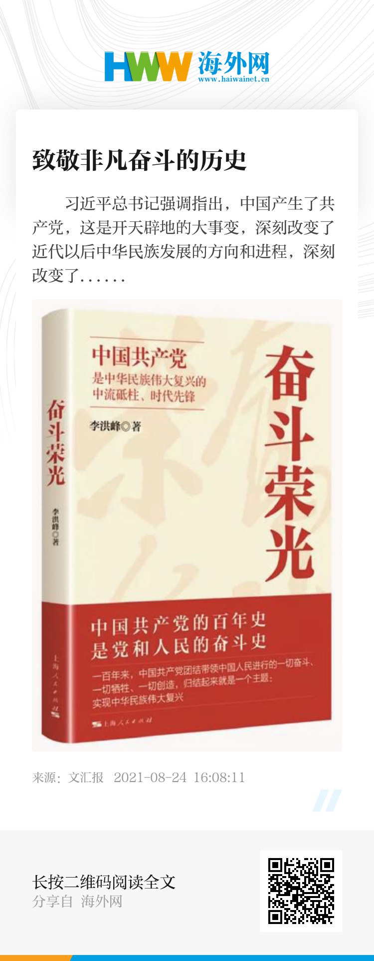 习近平总书记强调指出,中国产生了共产党,这是开天辟地的大事变,深刻改变了近代以后中华民族发展的方向和进程,深刻改变了中国人民和中华民族的前途和命运,深刻改变了世界发展的趋势和格局。这“三个深刻改变”,生动诠释了一百年来中国共产党人带领中国人民、中华民族非凡奋斗而铸就的彪炳史册的辉煌成就。而中国共产党不懈奋斗开辟了一条独特壮阔的强党之路,矢志不渝、坚忍不拔写就了开天辟地、改天换地、翻天覆地、经天纬地的奋斗史诗。近日,由上海人民出版社出版的李洪峰同志新著《奋斗荣光》,用心把握重大事件、重要会议、重要人物,坚持史论结合、史理结合、史实结合,系统梳理、高度凝练中国共产党百年奋斗历程、重要规律和时代启示。细细品来,历史瞬间映入眼帘,伟大成就历历在目,民族复兴前景光明!