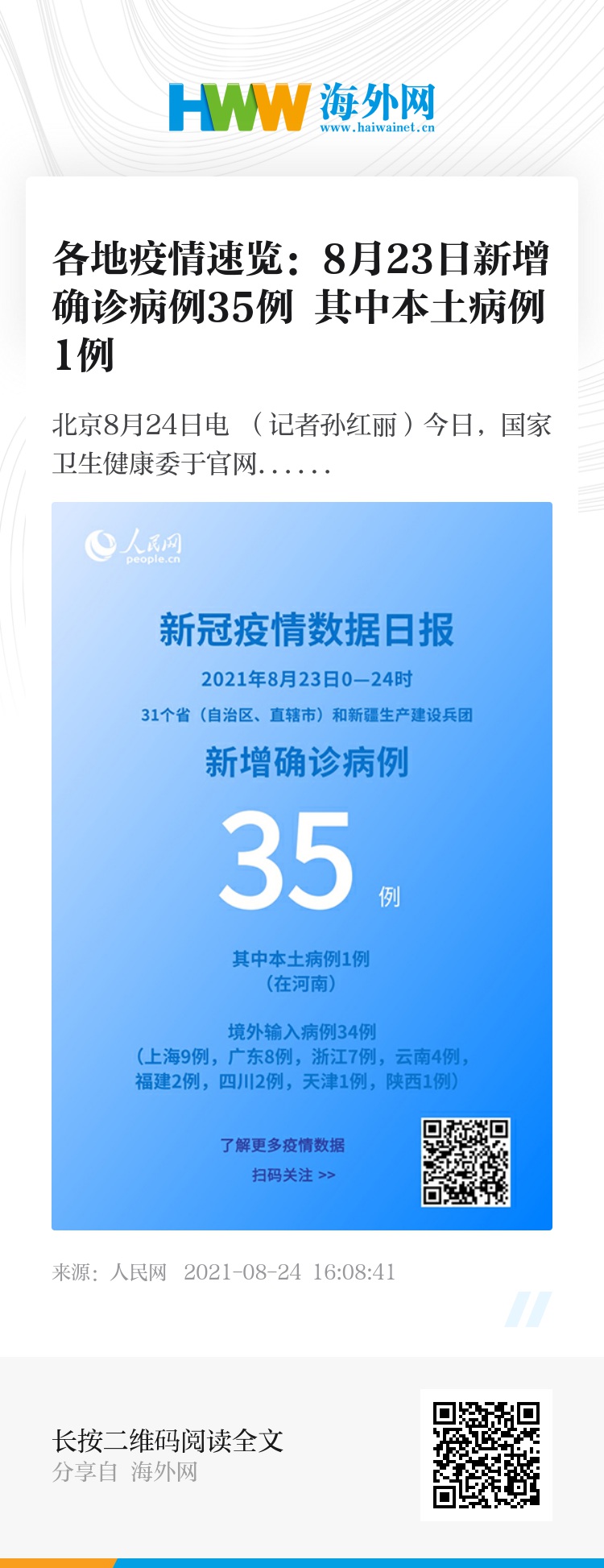 人民网北京8月24日电 (记者孙红丽)今日,国家卫生健康委于官网发布了截至8月23日24时新型冠状病毒肺炎疫情最新情况。8月23日0―24时,31个省(自治区、直辖市)和新疆生产建设兵团报告新增确诊病例35例,其中境外输入病例34例(上海9例,广东8例,浙江7例,云南4例,福建2例,四川2例,天津1例,陕西1例),本土病例1例(在河南);无新增死亡病例;新增疑似病例1例,为境外输入病例(在上海)。
