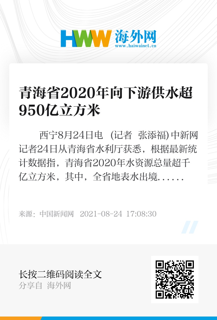 中新网西宁8月24日电 (记者 张添福)中新网记者24日从青海省水利厅获悉,根据最新统计数据指,青海省2020年水资源总量超千亿立方米,其中,全省地表水出境水量954.98亿立方米。
