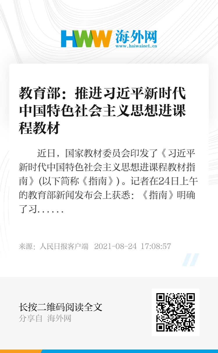 近日,国家教材委员会印发了《习近平新时代中国特色社会主义思想进课程教材指南》(以下简称《指南》)。记者在24日上午的教育部新闻发布会上获悉:《指南》明确了习近平新时代中国特色社会主义思想的核心要义、理论与实践贡献、方法论、理论品格和历史地位等作为主要学习内容。