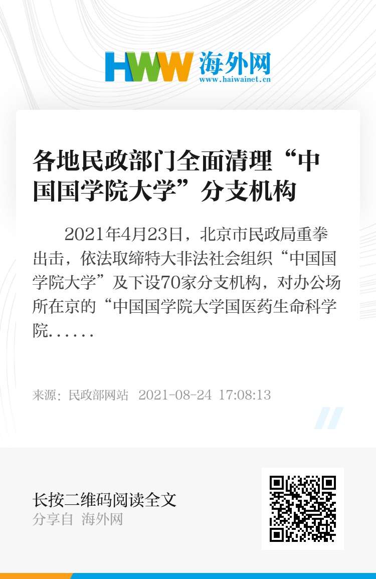 2021年4月23日,北京市民政局重拳出击,依法取缔特大非法社会组织“中国国学院大学”及下设70家分支机构,对办公场所在京的“中国国学院大学国医药生命科学院”、“中国国学院大学国医药生命科学院量子医学研究院”两家分支机构予以摘牌,拔除了社会组织领域的一颗“毒瘤”。