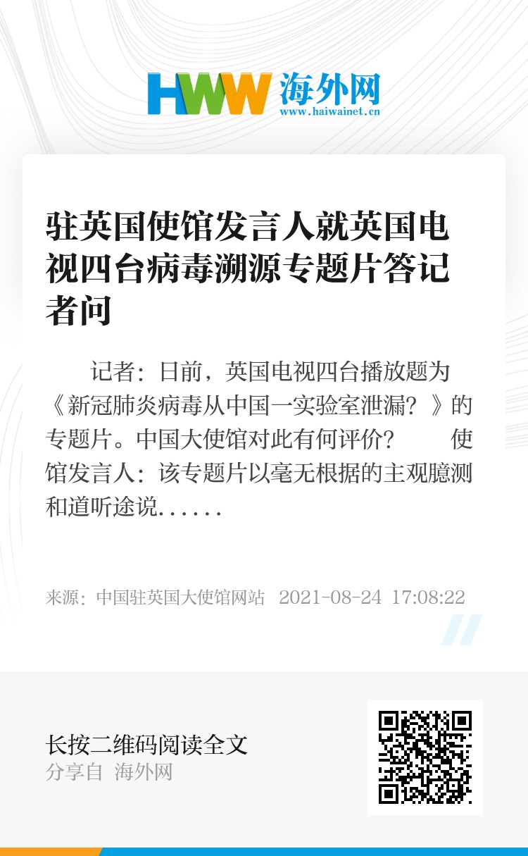 记者:日前,英国电视四台播放题为《新冠肺炎病毒从中国一实验室泄漏?》的专题片。中国大使馆对此有何评价?