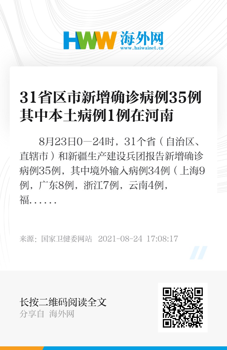8月23日0―24时,31个省(自治区、直辖市)和新疆生产建设兵团报告新增确诊病例35例,其中境外输入病例34例(上海9例,广东8例,浙江7例,云南4例,福建2例,四川2例,天津1例,陕西1例),本土病例1例(在河南);无新增死亡病例;新增疑似病例1例,为境外输入病例(在上海)。