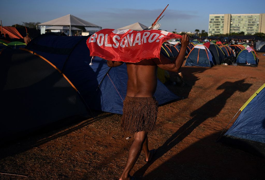 当地时间2021年8月22日,在巴西首都巴西利亚,当地的巴西土著部落居民举行示威活动,反对大规模开采土著部落居留地的法案。图片来源:人民视觉