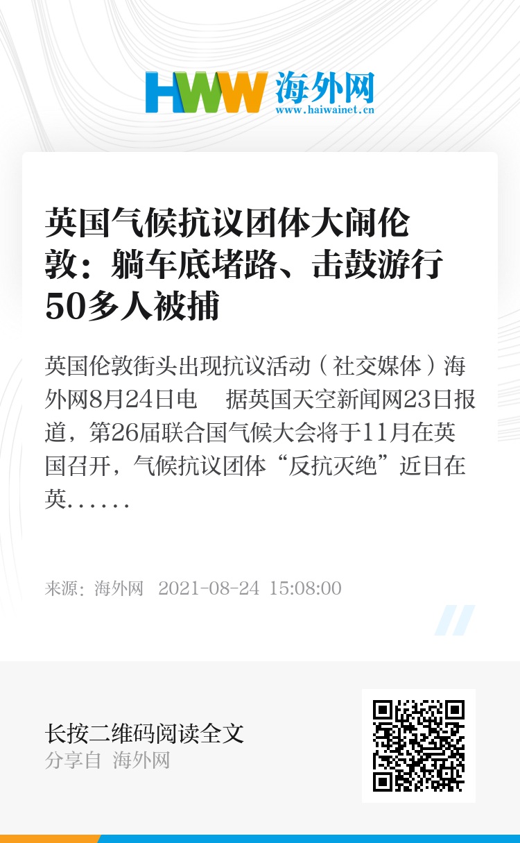 海外网8月24日电 据英国天空新闻网23日报道,第26届联合国气候大会将于11月在英国召开,气候抗议团体“反抗灭绝”近日在英国伦敦街头发起抗议活动,扰乱城市交通,50余人被警方拘捕。
