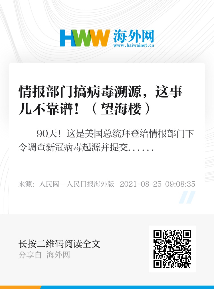 病毒溯源是严肃的科学问题,目的是为了研究新冠病毒如何跨越物种传播,从而更科学地应对疫情挑战,防止类似的疫情大流行再度发生。可美国情报部门主导的所谓病毒溯源,无关科学,纯属政治操弄。对此,明眼人一看便知。