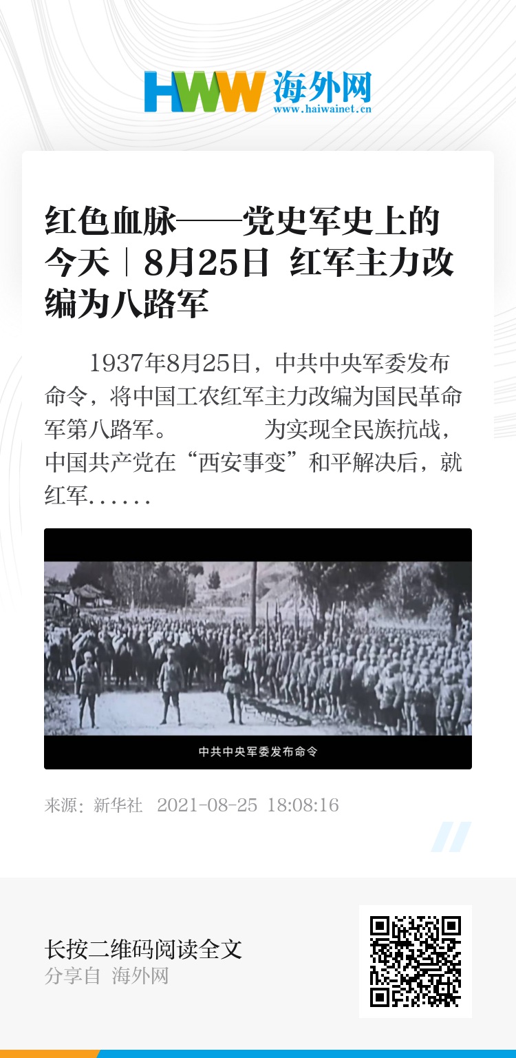 1937年8月25日,中共中央军委发布命令,将中国工农红军主力改编为国民革命军第八路军。