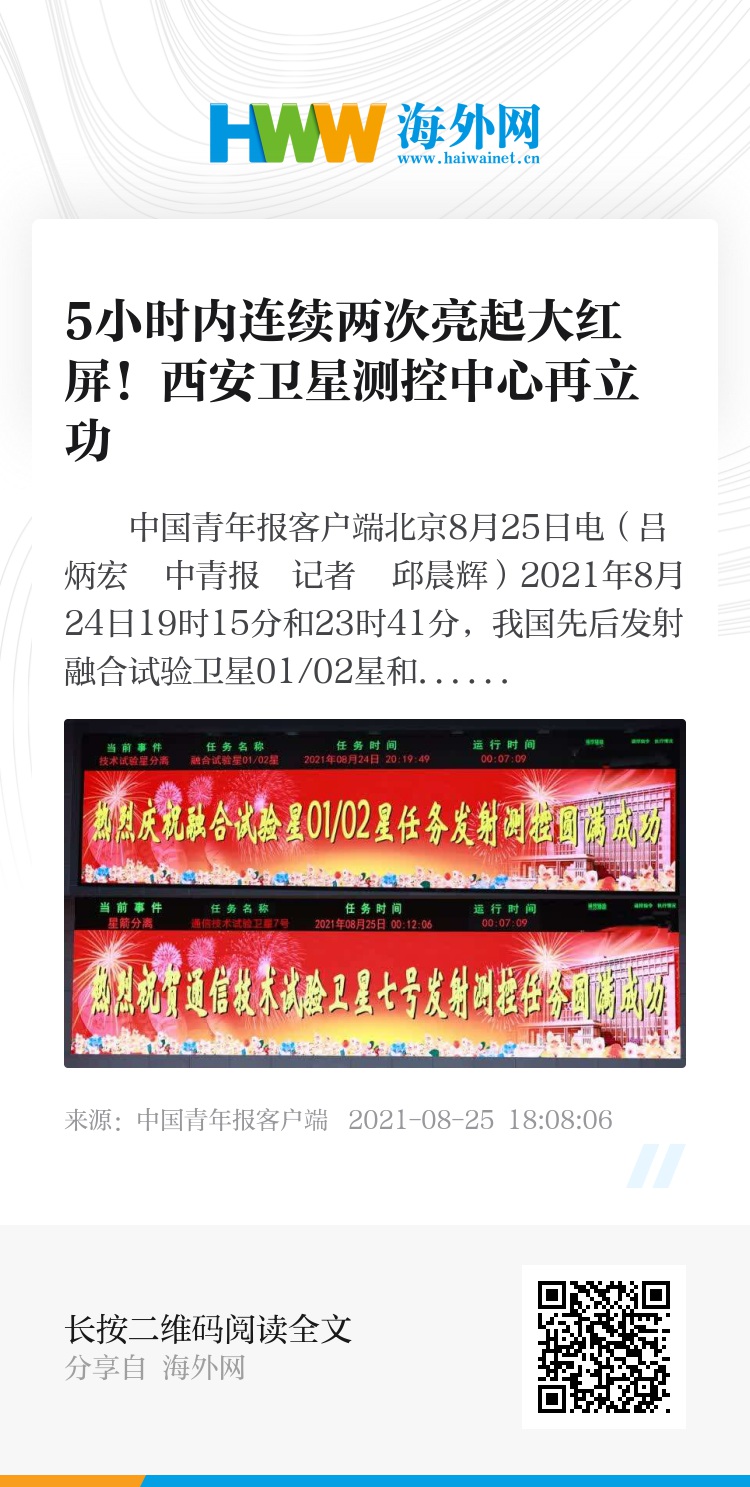 中国青年报客户端北京8月25日电(吕炳宏 中青报・中青网记者 邱晨辉)2021年8月24日19时15分和23时41分,我国先后发射融合试验卫星01/02星和通信技术试验卫星七号,作为我国测控系统主体单位,西安卫星测控中心完成了多点并行测控任务,连续两次亮起成功的大红屏,该中心执行并行发射测控任务的能力再一次得到检验。