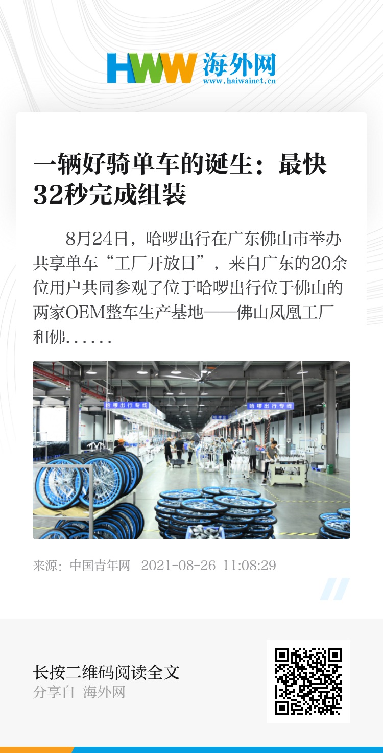 8月24日,哈啰出行在广东佛山市举办共享单车“工厂开放日”,来自广东的20余位用户共同参观了位于哈啰出行位于佛山的两家OEM整车生产基地——佛山凤凰工厂和佛山金川科力远。在工厂车间,记者了解到,一辆哈啰单车最快32秒就能够组装下线。在科力远的生产线上,活动参与者还尝试亲手组装一辆共享单车。