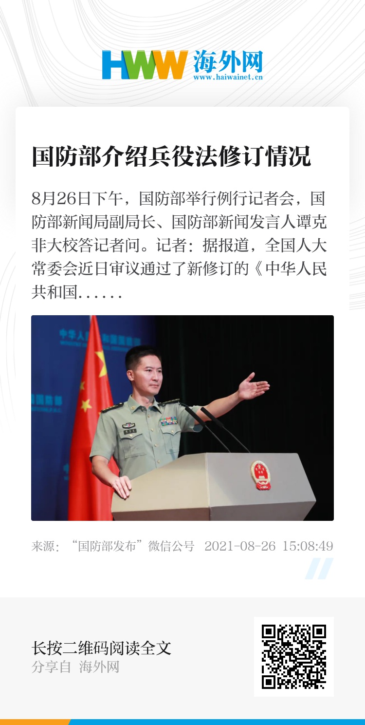 记者:据报道,全国人大常委会近日审议通过了新修订的《中华人民共和国兵役法》。请问此次修订兵役法的主要考虑是什么?在兵役政策制度方面做了哪些创新和完善?