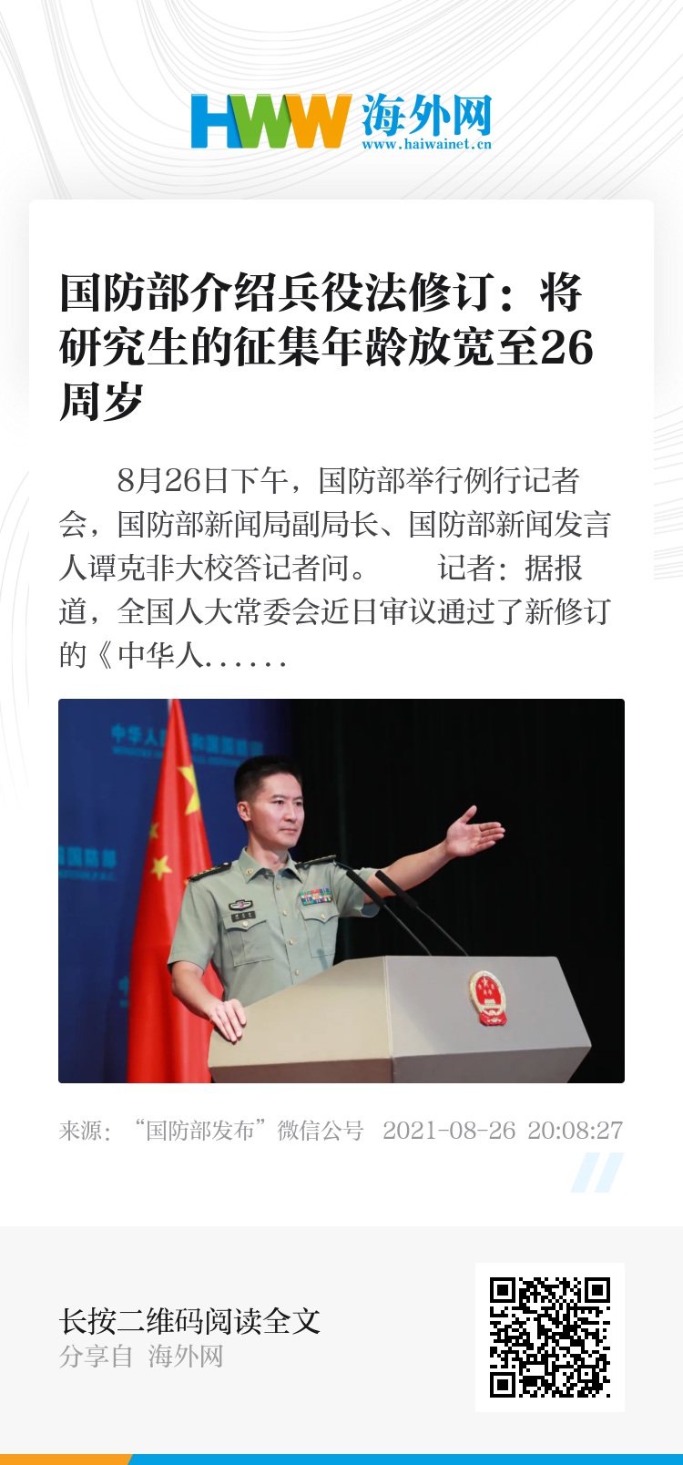 谭克非: 兵役法是国家军事制度方面的重要法律,对于规范和加强国家兵役工作,保证公民依法服兵役,保障军队兵员补充和储备,建设巩固国防和强大军队,具有十分重要的意义。8月20日,十三届全国人民代表大会常务委员会第三十次会议审议通过新修订的《中华人民共和国兵役法》。同日,国家主席习近平签署第九十五号主席令予以公布,自2021年10月1日起施行。