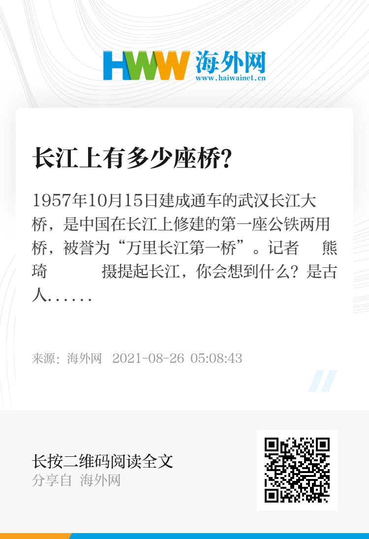 新中国成立前的漫长岁月里,长江万里无一桥,山河处处难飞渡;如今,人们说,万里长江百座桥,实际上已经远超百座。1956年,毛泽东在武汉视察时,游泳横渡长江,见大桥初显轮廓,挥笔写下“一桥飞架南北,天堑变通途”的名句。随着越来越多的跨江大桥接连架起,长江早已不是“天堑”,而成了真正的“通途”。