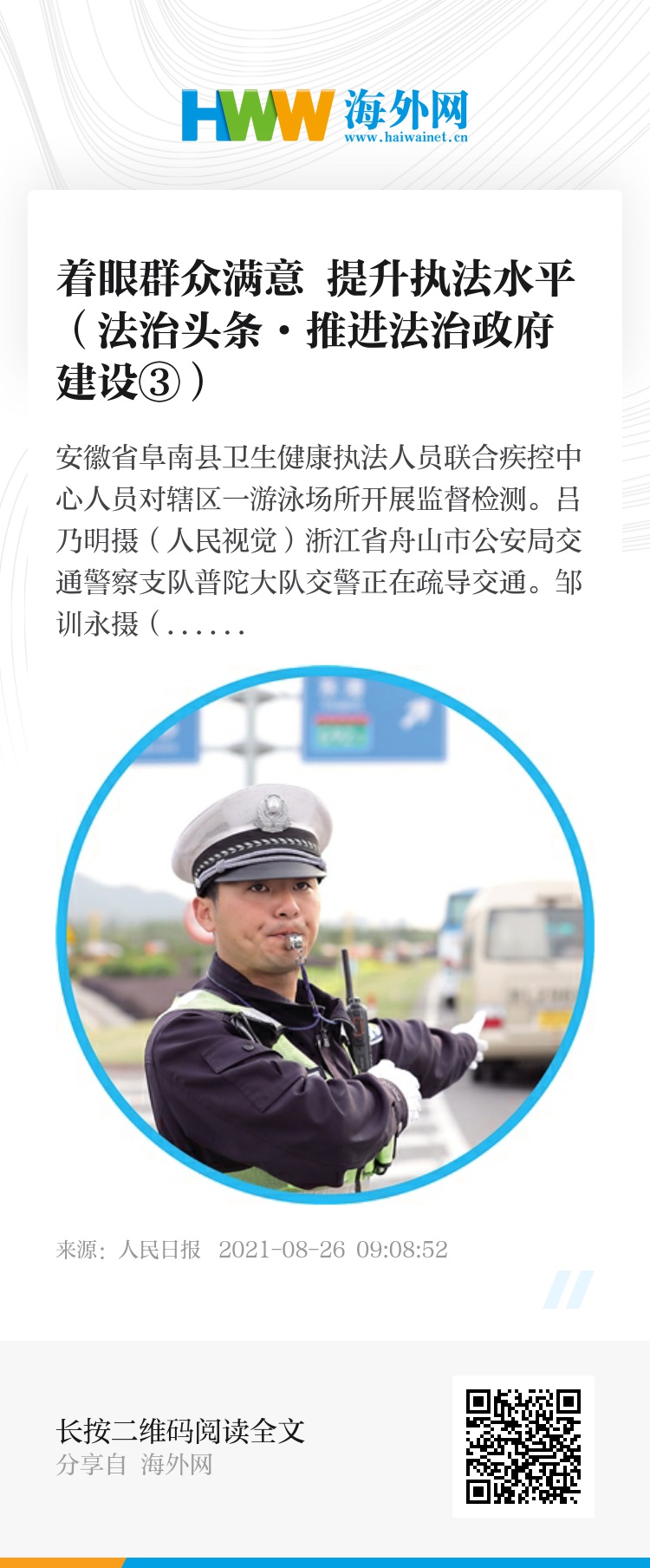 近日,中共中央、国务院印发的《法治政府建设实施纲要(2021—2025年)》提出,着眼提高人民群众满意度,着力实现行政执法水平普遍提升,努力让人民群众在每一个执法行为中都能看到风清气正、从每一项执法决定中都能感受到公平正义。