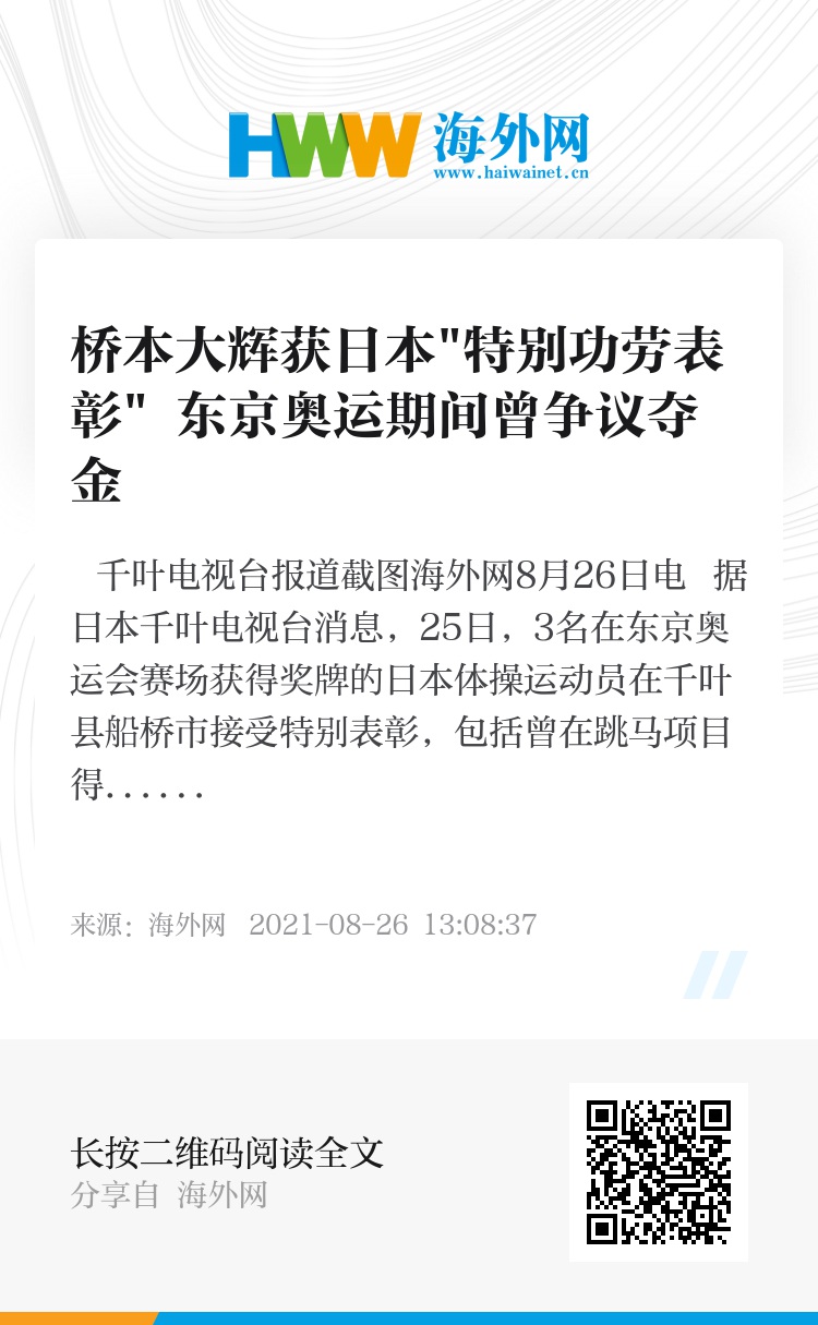 海外网8月26日电 据日本千叶电视台消息,25日,3名在东京奥运会赛场获得奖牌的日本体操运动员在千叶县船桥市接受特别表彰,包括曾在跳马项目得分过高被全球网民质疑的桥本大辉。