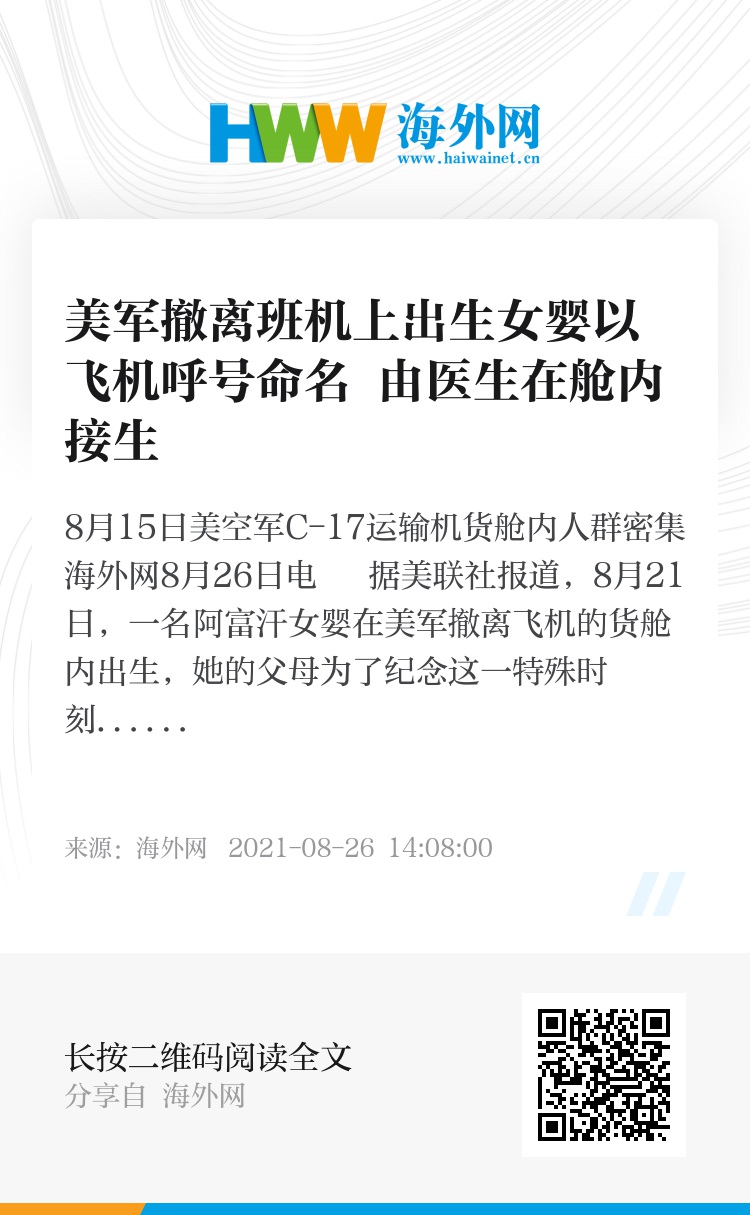 海外网8月26日电 据美联社报道,8月21日,一名阿富汗女婴在美军撤离飞机的货舱内出生,她的父母为了纪念这一特殊时刻,以这架飞机的呼号“Reach828”给女儿命名“瑞琪”。