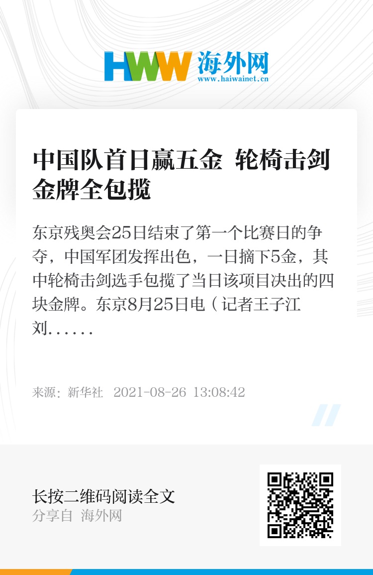 新华社东京8月25日电(记者王子江 刘金辉 刘扬涛)东京残奥会25日结束了第一个比赛日的争夺,中国军团发挥出色,一日摘下5金,其中轮椅击剑选手包揽了当日该项目决出的四块金牌。