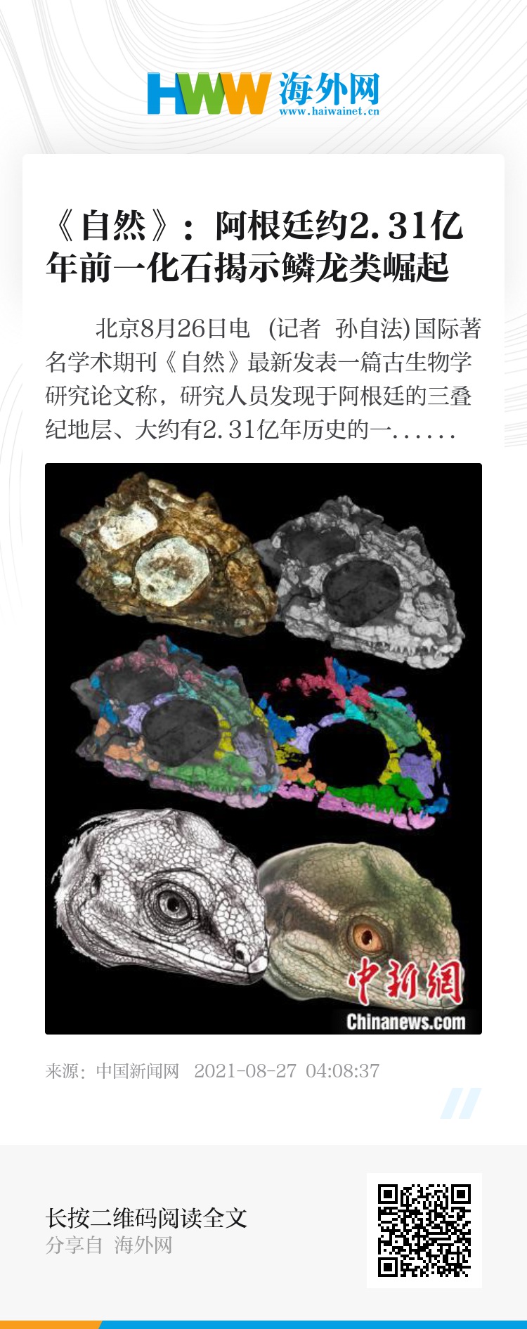 中新网北京8月26日电 (记者 孙自法)国际著名学术期刊《自然》最新发表一篇古生物学研究论文称,研究人员发现于阿根廷的三叠纪地层、大约有2.31亿年历史的一个类似蜥蜴的爬行动物头骨化石,揭示了蛇、蜥蜴和喙头蜥等鳞龙类爬行动物类群的起源和崛起。
