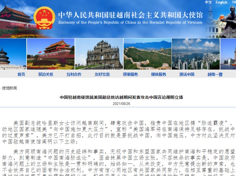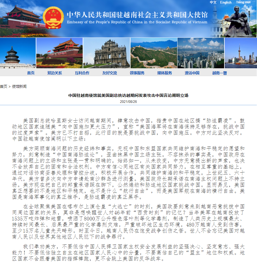 美国副总统哈里斯女士访问越南期间,肆意攻击中国,指责中国在地区搞“胁迫霸凌”,鼓动地区国家追随美“向中国施加更大压力”,宣称“美国海军将在南海保持足够存在,挑战中国的过度声索”。美方已不打自招,此行目的就是要挑战中国,向中国施压。中方对此坚决反对。中国驻越南使馆阐明以下立场: