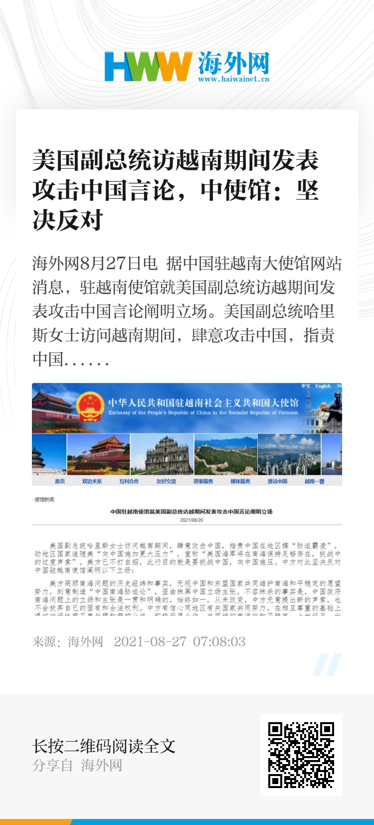 海外网8月27日电 据中国驻越南大使馆网站消息,驻越南使馆就美国副总统访越期间发表攻击中国言论阐明立场。