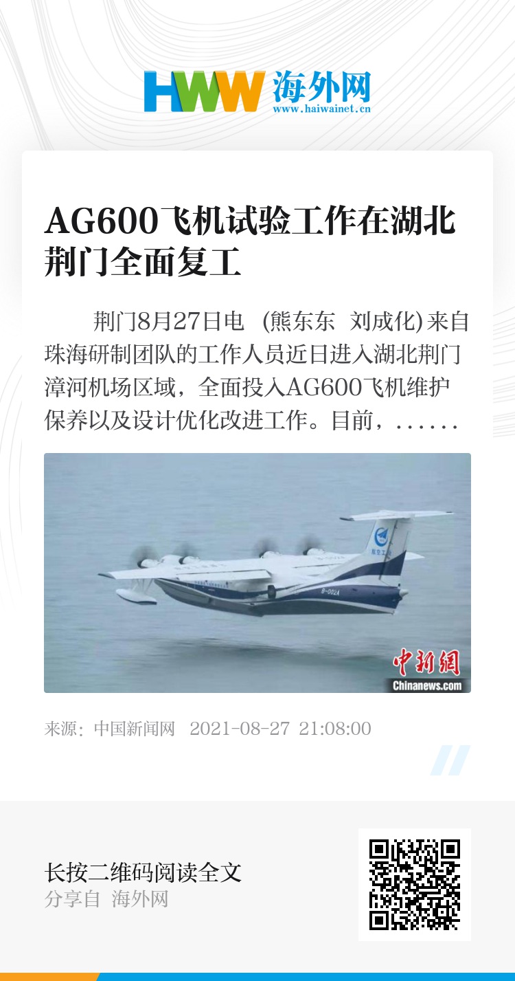 中新网荆门8月27日电 (熊东东 刘成化)来自珠海研制团队的工作人员近日进入湖北荆门漳河机场区域,全面投入AG600飞机维护保养以及设计优化改进工作。目前,AG600飞机高原适应性试飞工作已全部准备就绪。
