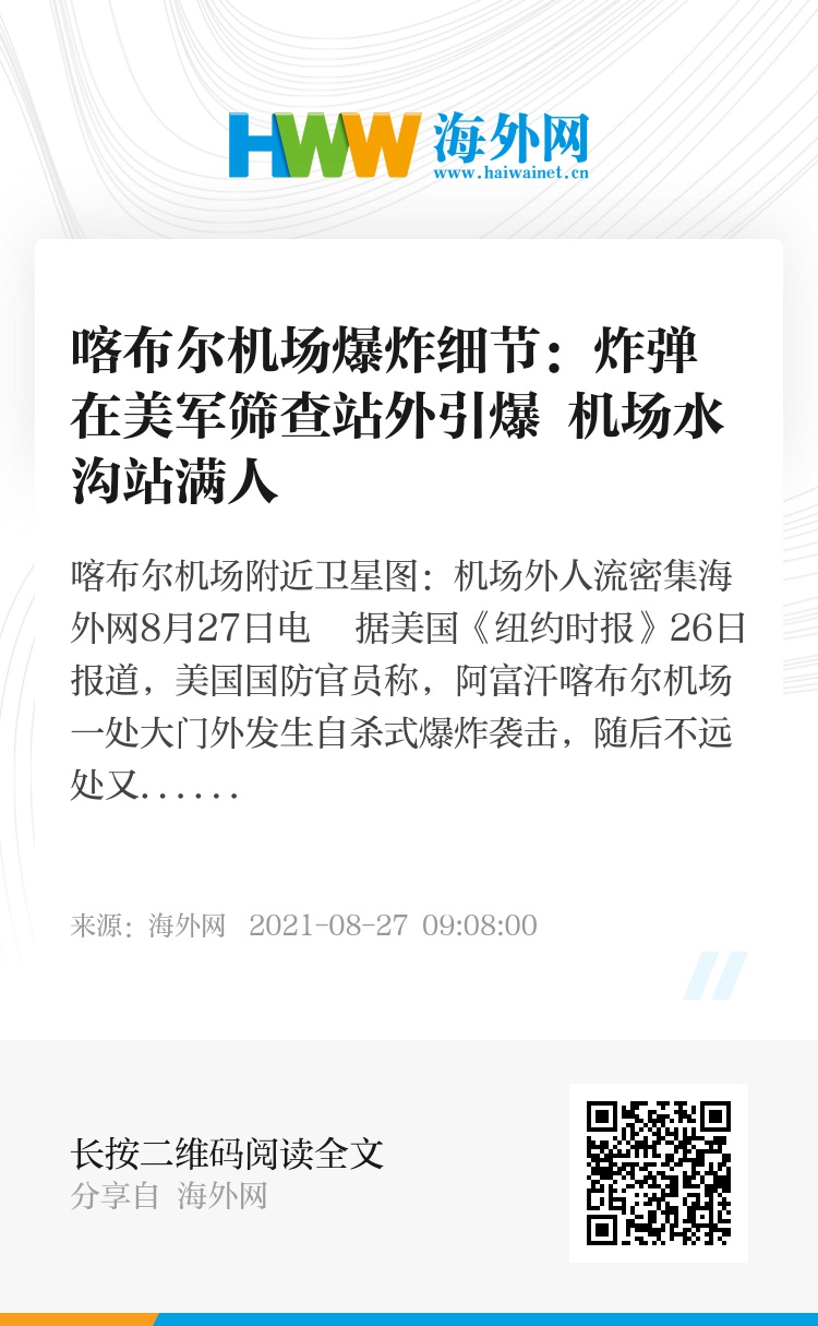 海外网8月27日电 据美国《纽约时报》26日报道,美国国防官员称,阿富汗喀布尔机场一处大门外发生自杀式爆炸袭击,随后不远处又发生爆炸,导致包括13名美军人员在内的数十人死亡。根据爆炸发生前数小时的卫星图片和现场照片显示,机场外有一圈水渠,渠内密密麻麻地挤满了试图进入机场的阿富汗民众,两处爆炸地点在美军的筛查处大门附近,相距不过几百英尺(数十米)。