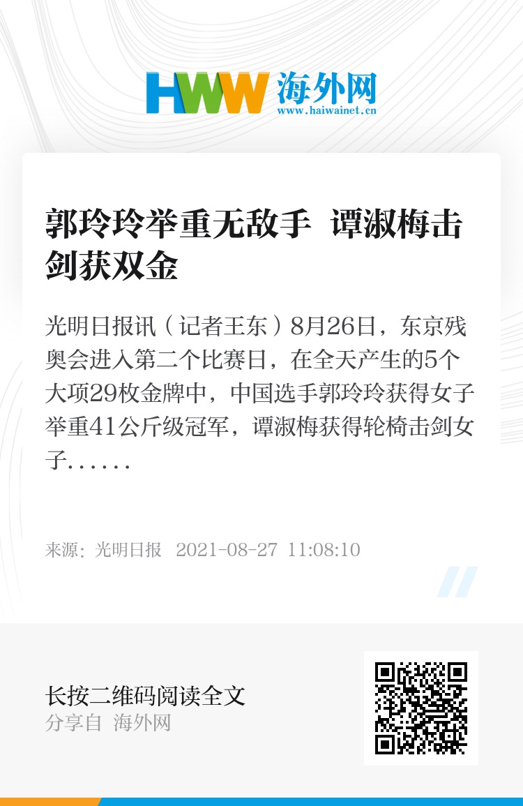 光明日报讯(记者王东)8月26日,东京残奥会进入第二个比赛日,在全天产生的5个大项29枚金牌中,中国选手郭玲玲获得女子举重41公斤级冠军,谭淑梅获得轮椅击剑女子重剑个人赛B级金牌,在26日进行的游泳项目混合4×50米自由泳接力20分项目的决赛中,中国队夺得金牌。