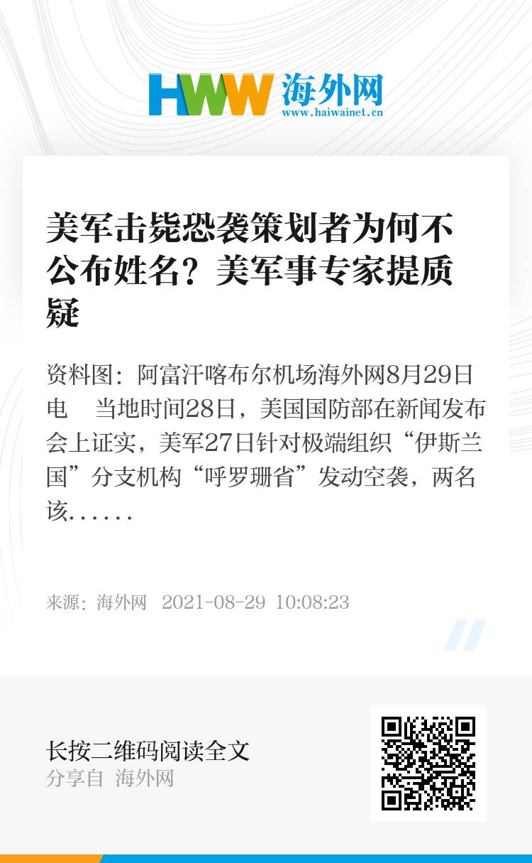 海外网8月29日电 当地时间28日,美国国防部在新闻发布会上证实,美军27日针对极端组织“伊斯兰国”分支机构“呼罗珊省”发动空袭,两名该组织“重要目标人物”被击毙,但未公布这两人的名字和具体情况。对此,有美国军事专家提出质疑,认为不公布姓名是因为这两人并非重要人物。