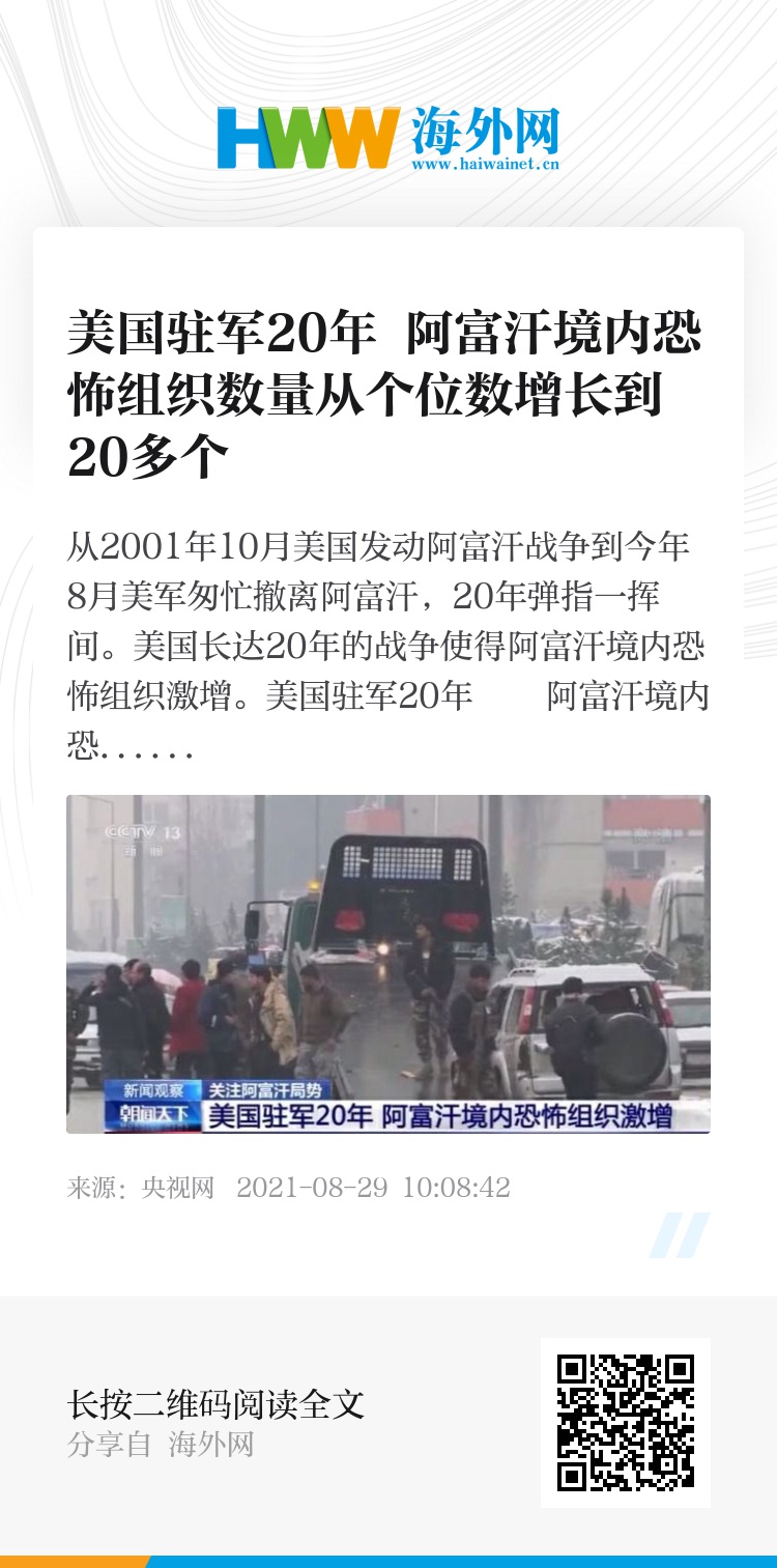 从2001年10月美国发动阿富汗战争到今年8月美军匆忙撤离阿富汗,20年弹指一挥间。美国长达20年的战争使得阿富汗境内恐怖组织激增。