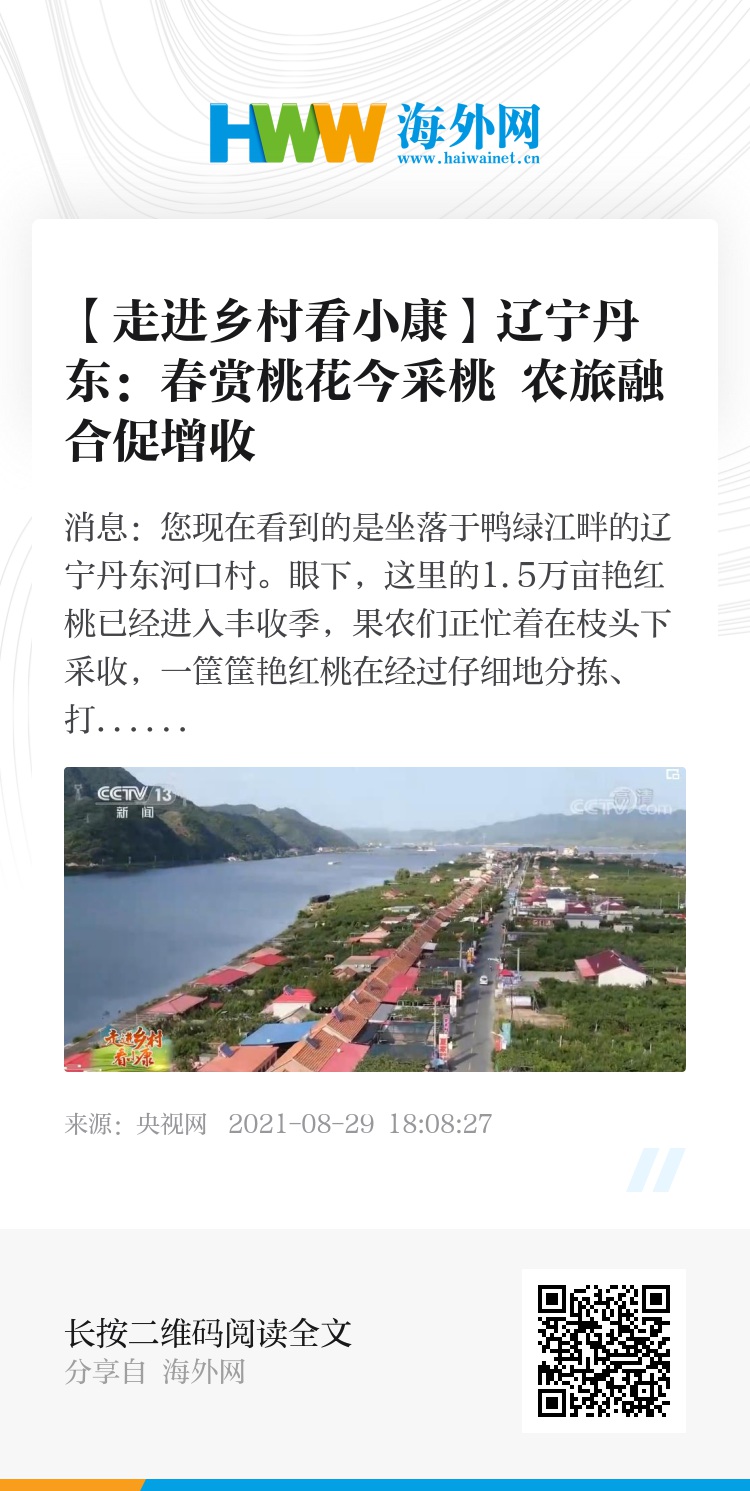 央视网消息:您现在看到的是坐落于鸭绿江畔的辽宁丹东河口村。眼下,这里的1.5万亩艳红桃已经进入丰收季,果农们正忙着在枝头下采收,一筐筐艳红桃在经过仔细地分拣、打包后将发往全国各地。