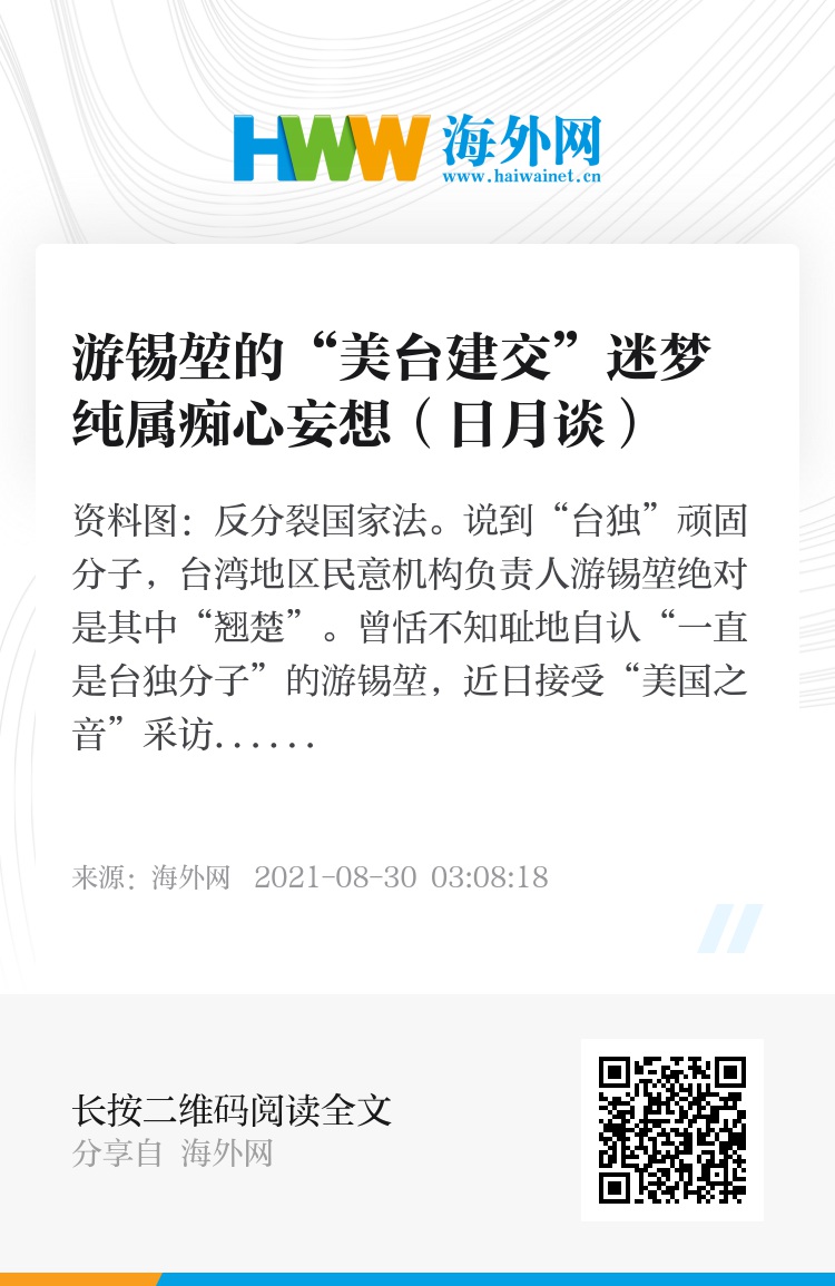 说到“台独”顽固分子,台湾地区民意机构负责人游锡堃绝对是其中“翘楚”。曾恬不知耻地自认“一直是台独分子”的游锡堃,近日接受“美国之音”采访时,再次鼓吹“美台建交”,并表示蔡英文提“中华民国台湾”按理说就是“台独”,民进党当局通过“修法”“修宪”等方式,逐步让“台湾迈向国家正常化”。此番言论完全暴露出其甘当外部势力“棋子”、顽固推动“台独”的本性。“台独”分裂势力利令智昏,妄图押宝外部势力,与全体中华儿女和中华民族根本利益为敌,必将自食恶果。