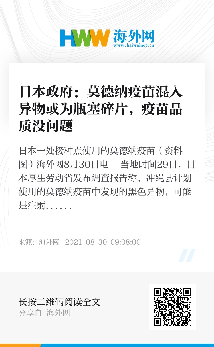 另据日本媒体早前报道,本月16日以来,位于东京都、埼玉县、茨城县、爱知县和岐阜县的8处新冠疫苗接种中心在39支尚未使用的莫德纳疫苗瓶内发现异物。此外,两名日本男子8月接种第二剂莫德纳新冠疫苗后死亡。厚生省说,正在调查两人死因,尚不清楚是否关联疫苗接种。(海外网 王西洛)