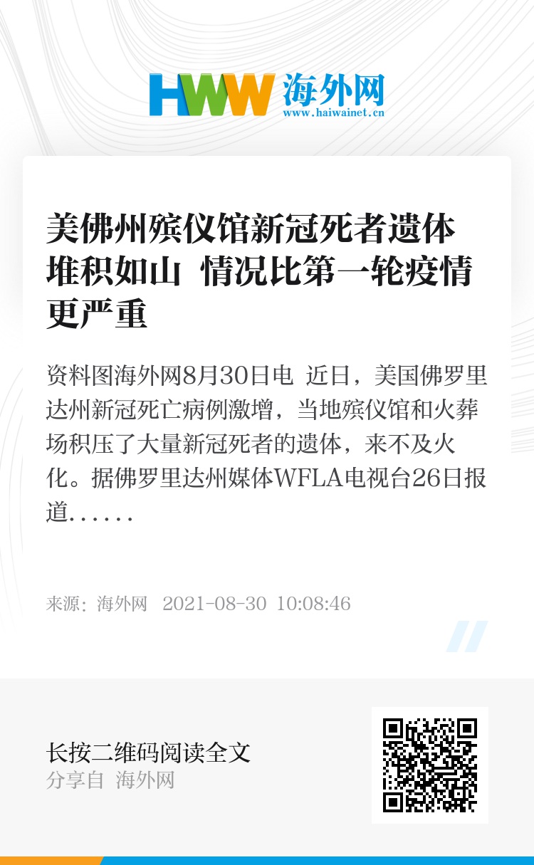 海外网8月30日电 近日,美国佛罗里达州新冠死亡病例激增,当地殡仪馆和火葬场积压了大量新冠死者的遗体,来不及火化。
