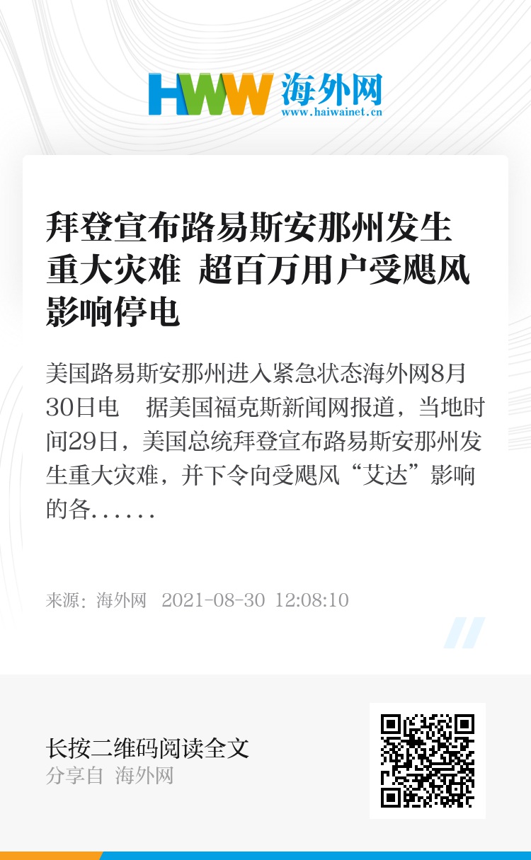 海外网8月30日电 据美国福克斯新闻网报道,当地时间29日,美国总统拜登宣布路易斯安那州发生重大灾难,并下令向受飓风“艾达”影响的各级地方提供援助。