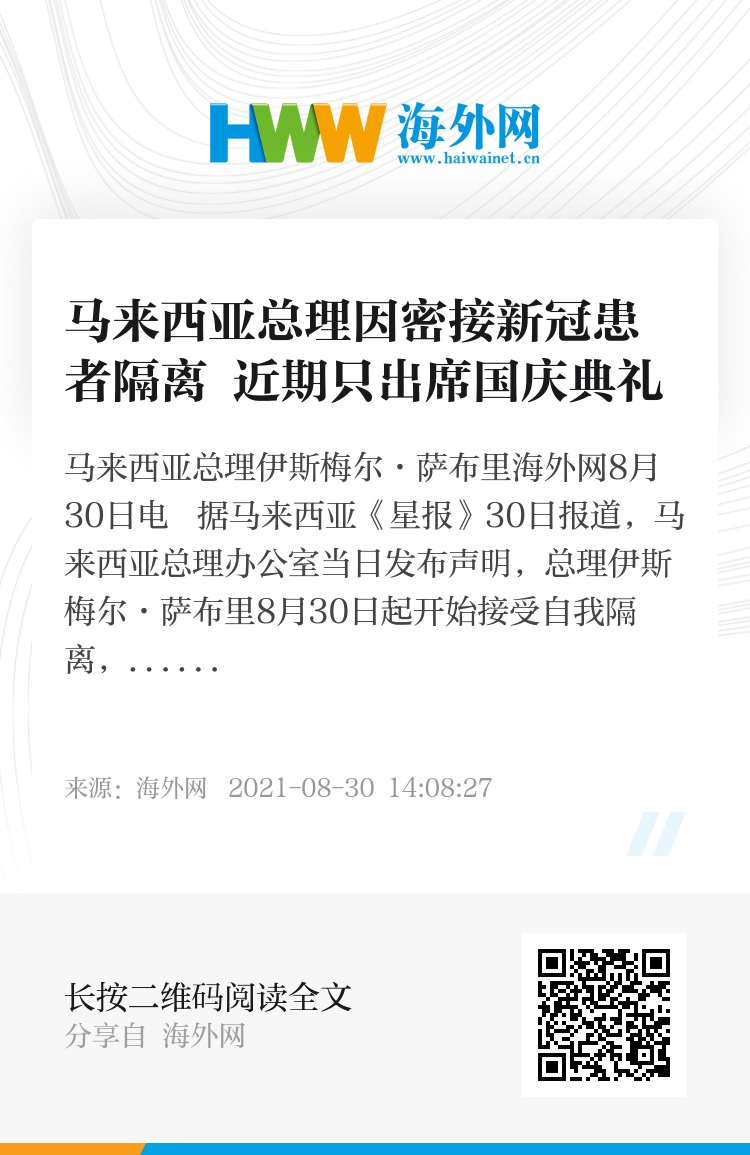 海外网8月30日电 据马来西亚《星报》30日报道,马来西亚总理办公室当日发布声明,总理伊斯梅尔·萨布里8月30日起开始接受自我隔离,此前他曾与新冠确诊患者有过接触。