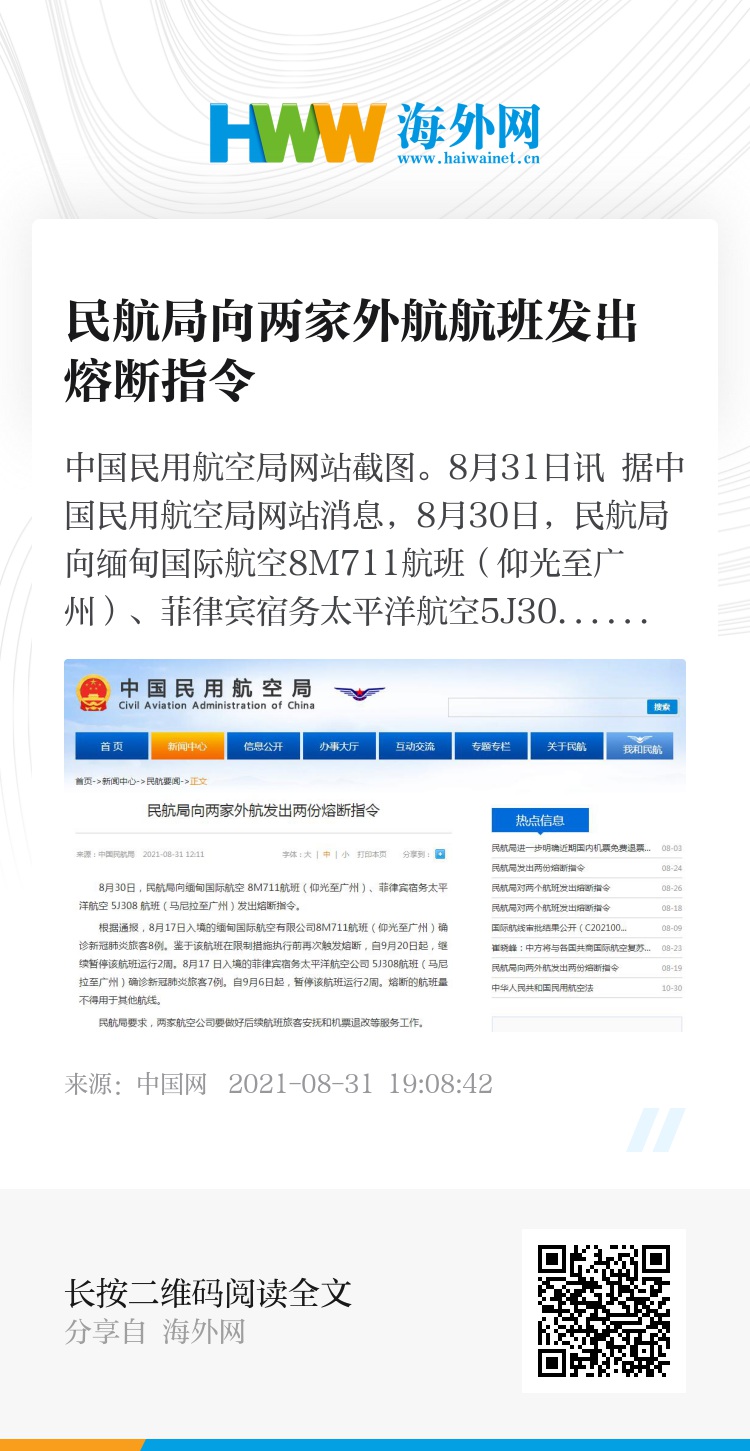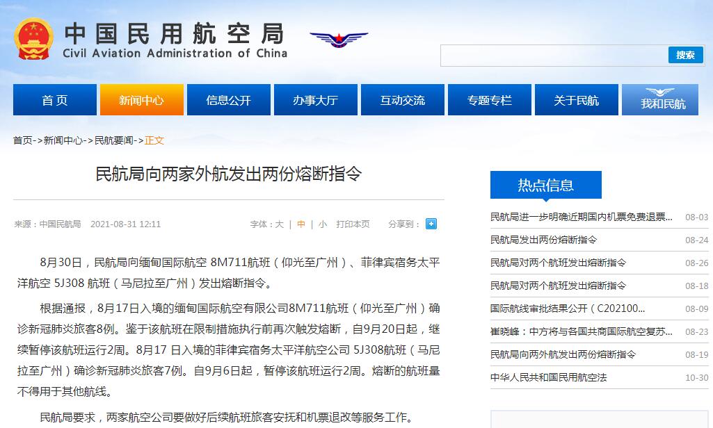 中国网8月31日讯 据中国民用航空局网站消息,8月30日,民航局向缅甸国际航空8M711航班(仰光至广州)、菲律宾宿务太平洋航空5J308航班(马尼拉至广州)发出熔断指令。
