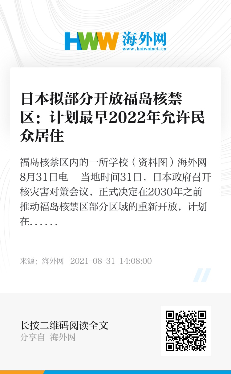 海外网8月31日电 当地时间31日,日本政府召开核灾害对策会议,正式决定在2030年之前推动福岛核禁区部分区域的重新开放,计划在2022年至2023年允许民众居住。