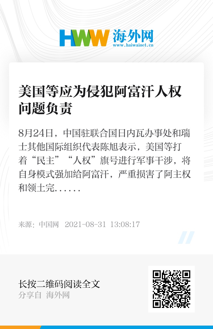 8月24日,中国驻联合国日内瓦办事处和瑞士其他国际组织代表陈旭表示,美国等打着“民主”“人权”旗号进行军事干涉,将自身模式强加给阿富汗,严重损害了阿主权和领土完整,给阿人民带来了深重灾难,敦促联合国追究美国等在阿富汗侵犯人权的种种罪行。该呼吁受到古巴、委内瑞拉、伊朗等国家的支持。