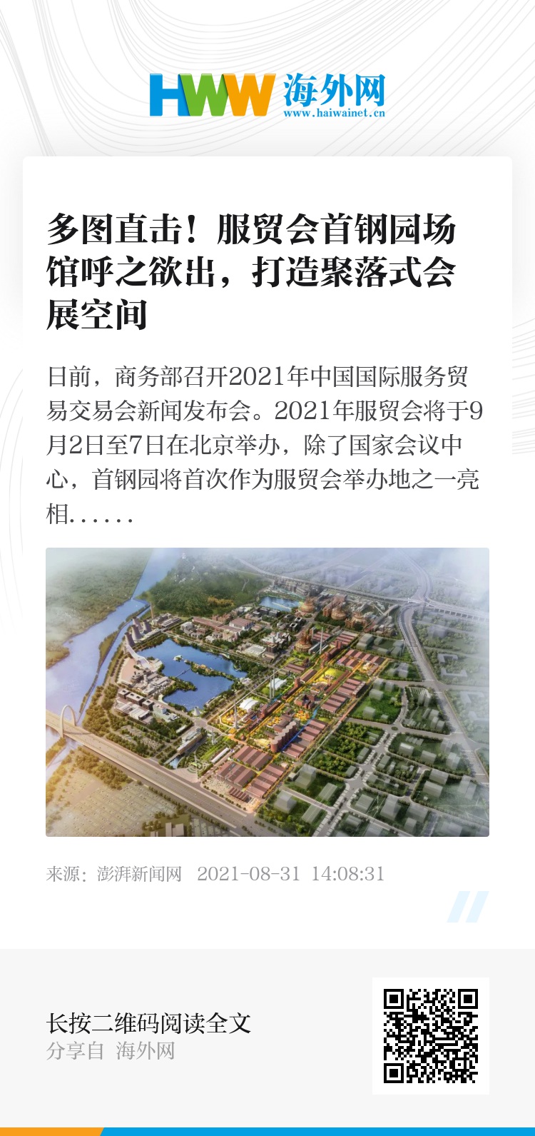 日前,商务部召开2021年中国国际服务贸易交易会新闻发布会。2021年服贸会将于9月2日至7日在北京举办,除了国家会议中心,首钢园将首次作为服贸会举办地之一亮相。截至目前,服贸会首钢园会场项目主体已基本完工,正在进行场馆内部装修、外部市政道路施工及景观绿化工作,预计7月底实现竣工交付并启动布展工作。